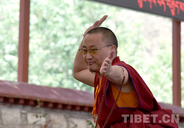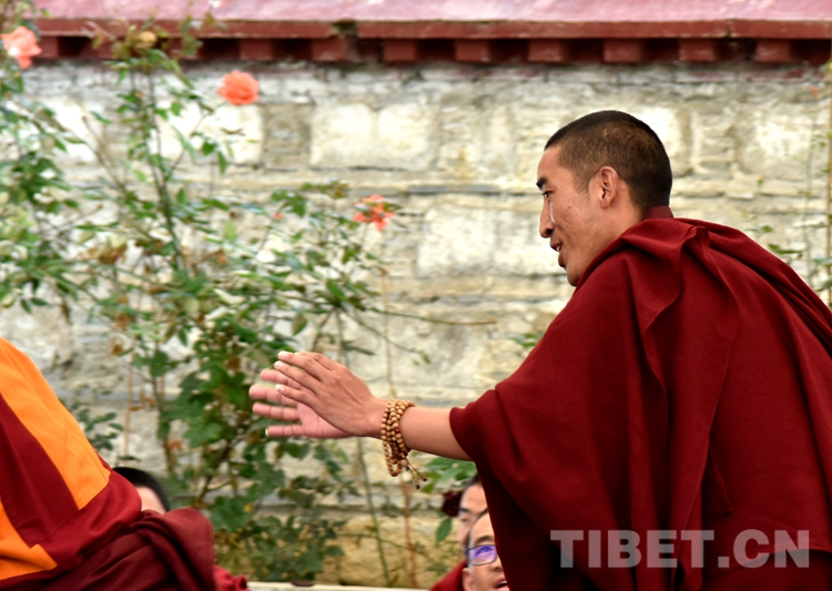 中國西藏網訊 身穿絳紅色袈裟,坐者仔細聆聽、站立者臂套念珠、迸出佛學妙語;圍觀者不時大笑……這是6月21日下午記者在西藏佛學院辯經場看到的“唇槍舌戰”。