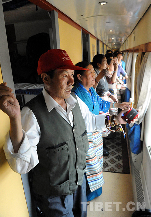 這是乘坐北京至拉薩列車的藏族旅客,在京藏列車上載歌載舞活動筋骨(唐召明2014年5月28日攝)