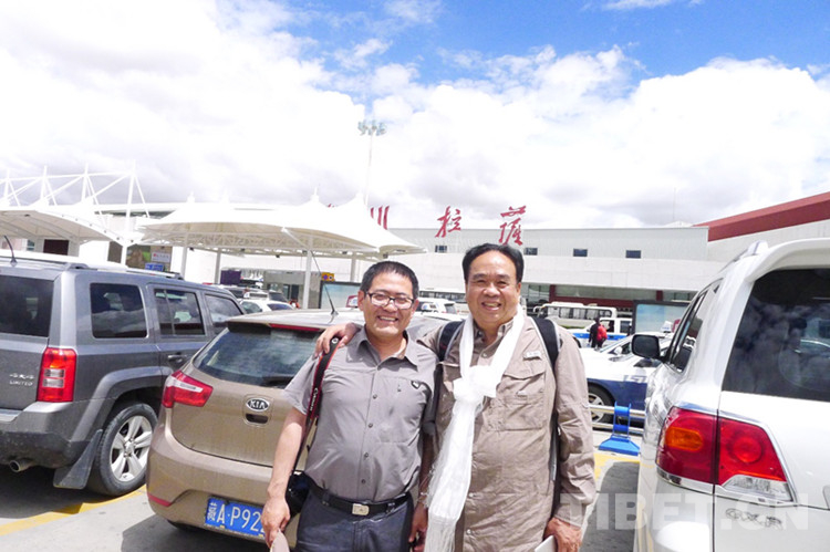 圖為時任中央人民廣播電臺、中國國際廣播電臺西藏記者站站長、現任中央廣播電視總臺西藏總站站長曾曉東到拉薩機場迎接。攝影 張桃花