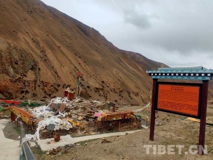 很快,車停了下來,司機指著公路邊的一塊田地說,這是米拉日巴尊者家的田地,旁邊一座佛塔是在他家遺址上修建的。又指著遠處一個大土包說,那是他父親的墓地。我環顧四周,山體顏色確實同山下差別很大,真像是被染紅的。沿著梯道上行,可見高處的一個山洞,便是米拉日巴尊者學佛回村的第一個修行洞。洞深約1米,高約3米,寬約5米。深處的頂部有一自然形成的海螺狀小眼,從其中往外一滴一滴滲著山泉水,下方有一突出的斜面石臺,正好接住滴落的水滴,水順著石臺往下流,人在石臺下方可用嘴直接飲用。據說,米拉日巴就是靠喝這水維持生命的。兩位看護修行洞的村民不時向我們介紹米拉日巴的神奇事跡,臨走時又遞給我們一個帶孔的扁平石子。她們說這石子是米拉日巴所持的佛珠灑落山間形成的,很有靈性,給我們留做紀念。