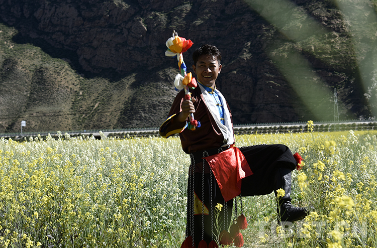 圖為墨竹工卡縣松贊文化旅游節暨第五屆油菜花節開幕式前,舞蹈演員在油菜花田中留影 攝影:王媛媛
