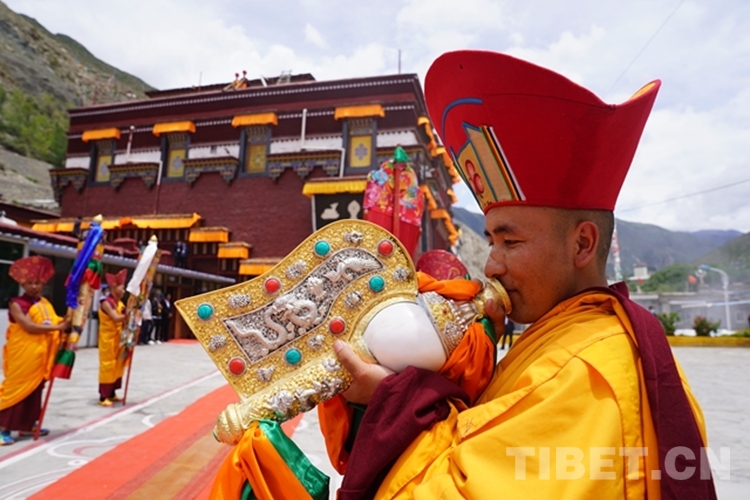 10時(shí)許,班禪抵達(dá)扎果寺。頓時(shí),法號(hào)長(zhǎng)鳴,鼓樂喧天,第六世德珠?加央西繞班旦活佛及僧眾以最隆重的宗教禮儀歡迎班禪的到來。