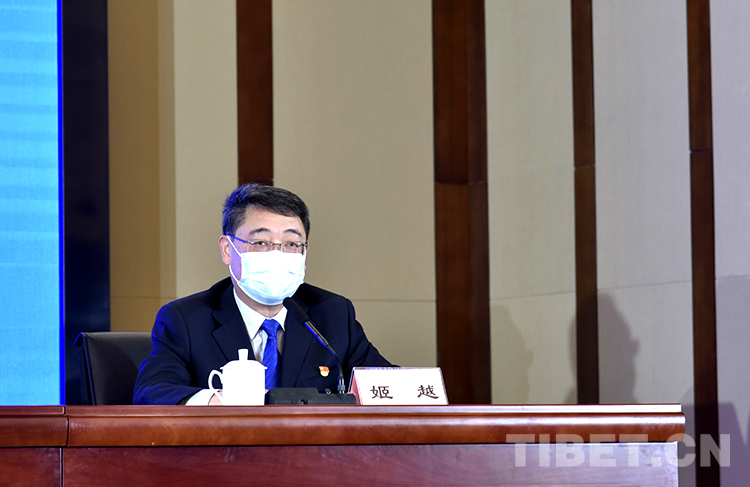 圖為西藏自治區新型冠狀病毒肺炎疫情防控工作第三場新聞發布會上,西藏自治區旅游發展廳黨組成員、副廳長姬越介紹游客服務保障方面工作 攝影:王媛媛
