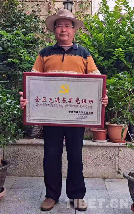 這是現任那曲駐拉薩第十退休黨支部書記加央多吉,手捧2021年所榮獲的中共西藏自治區委員會頒發的”全區先進基層黨組織“獎牌拍照留念(唐召明提供,2021年7月份攝)