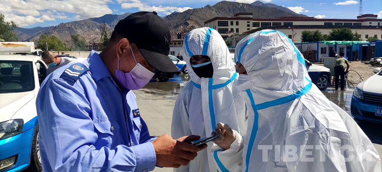 圖為在拉薩貢布堂路出租車洗車消毒點(diǎn),出租車駕駛員和兩位防疫志愿者交流核酸檢測(cè)結(jié)果查詢 攝影:趙良發(fā)