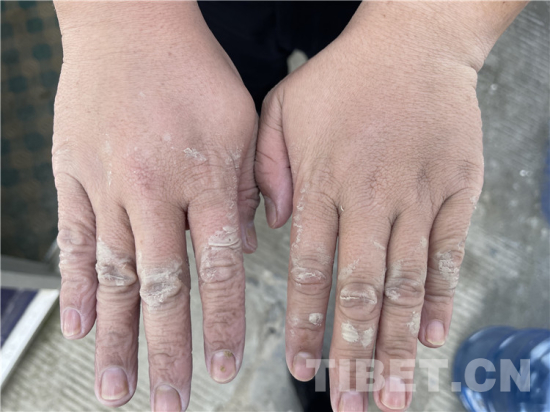 摘下戴了十幾個小時的手套,每根手指都被捂皺變形,關節處的皮膚泛白腫脹——看到日喀則邊境管理支隊吉隆邊境派出所民警桂浩的手部照片,讓人不禁淚目。