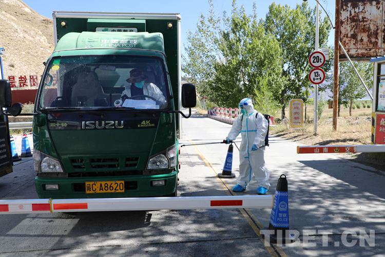 圖為瓊結縣公安局白那警務站警務人員為來往車輛及人員做消殺工作。熊起樊攝