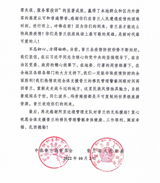 中國西藏網訊 “普蘭縣發生新冠肺炎疫情后,阿里邊境管理支隊第一時間選派精干力量支援普蘭疫情防控工作,為打贏疫情防控阻擊戰、攻堅戰發揮了至關重要的作用?!?0月2日,西藏自治區阿里邊境管理支隊收到一封來自阿里地區普蘭縣委的感謝信。信中對阿里邊境管理支隊戰“疫”一線民警在一個多月的疫情防控工作中,克服困難、勇于擔當、不分晝夜、持續奮戰的抗疫工作表達了感謝,給予了肯定。