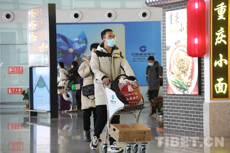 圖為在拉薩貢嘎機場內旅客攜帶西藏特產準備登機 攝影:王佳豪