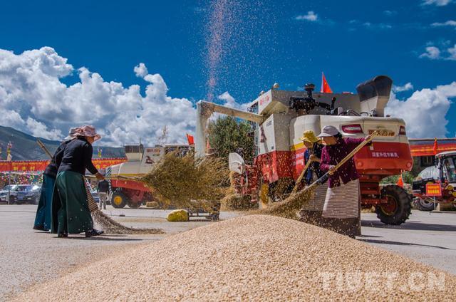 圖為2019年9月6日,2019?西藏“中國農民豐收節”暨扎囊縣氆氌文化節期間,西藏自治區山南市扎囊縣羊噶居委會機械化打麥現場 攝影:趙耀