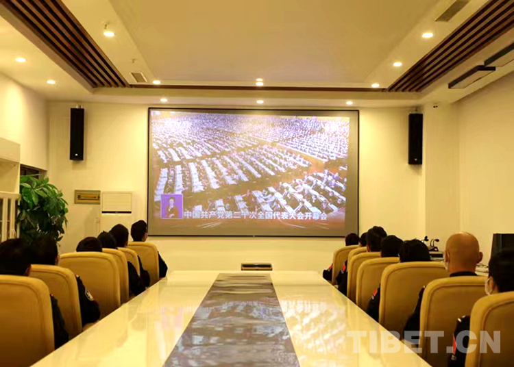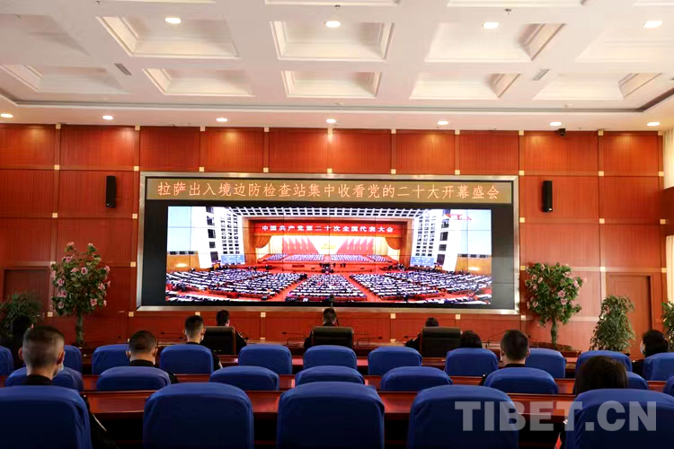圖為拉薩出入境邊防檢查站機關(guān)民警在指揮中心會議室組織觀看黨的二十大開幕會盛況直播