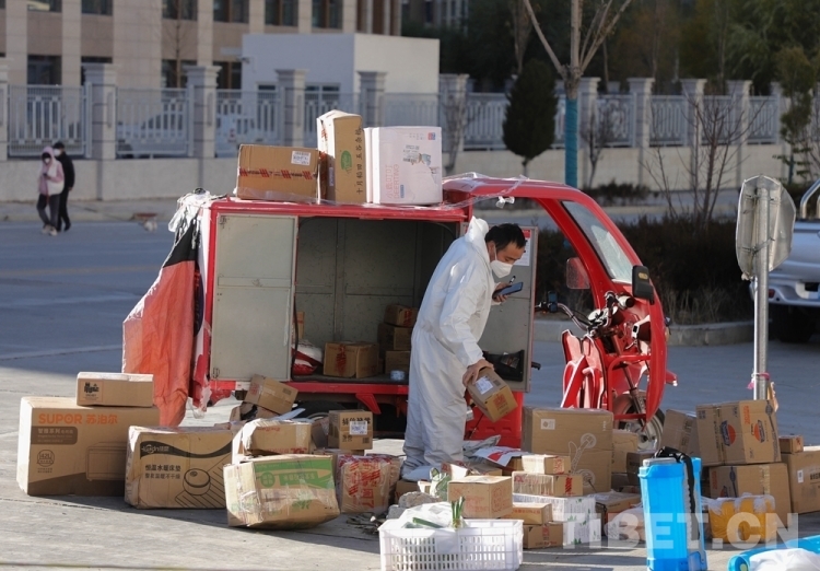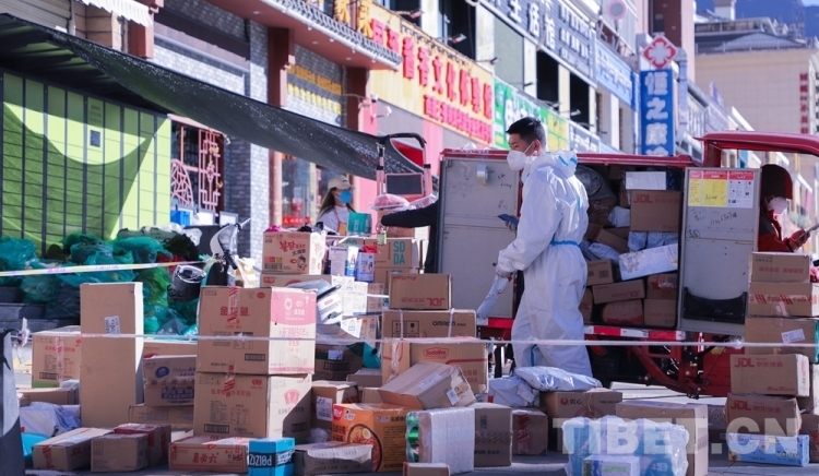 中國西藏網訊 隨著拉薩市疫情防控形勢整體持續向好,目前拉薩市郵政快遞業在落實好常態化疫情防控工作的基礎上,正有序復工復產。圖為快遞員無接觸配送快遞 攝影:賈華加(中國西藏網 記者/賈華加)