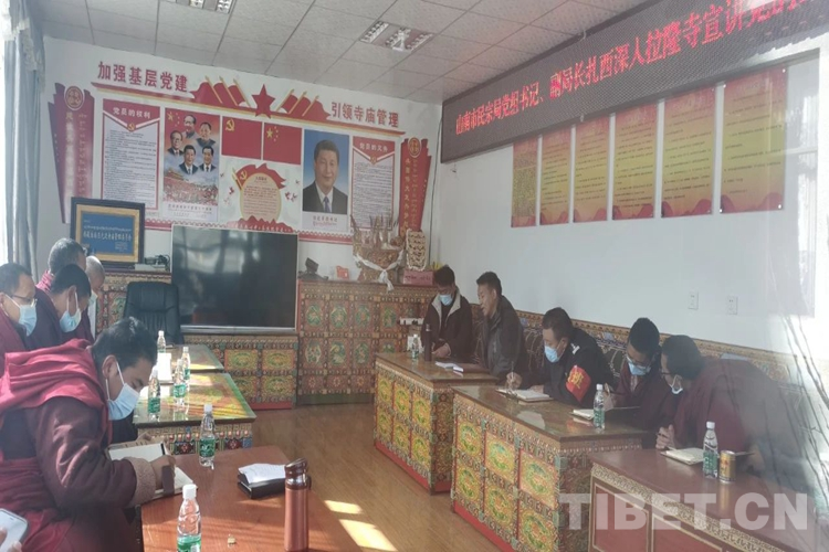 圖為洛扎縣拉隆寺僧人和駐寺干部深入學習黨的二十大精神,僧人們表示,要持續弘揚愛國愛教優良傳統,自覺踐行“四條標準”,不斷增進“五個認同”,牢固樹立“三個意識”,堅持藏傳佛教中國化方向,積極推動宗教與社會主義社會相適應,堅定不移聽黨話、感黨恩、跟黨走。