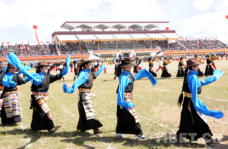 這是來自那曲地區(現那曲市)各縣代表隊在進行入場式表演。當日,那曲賽馬藝術節在藏北首府那曲鎮開幕(唐召明2013年8月10日攝)