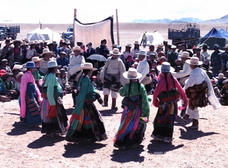 這是文部辦事處(現尼瑪縣)賽馬會上,牧民群眾在跳“鍋莊”舞(唐召明1987年攝)