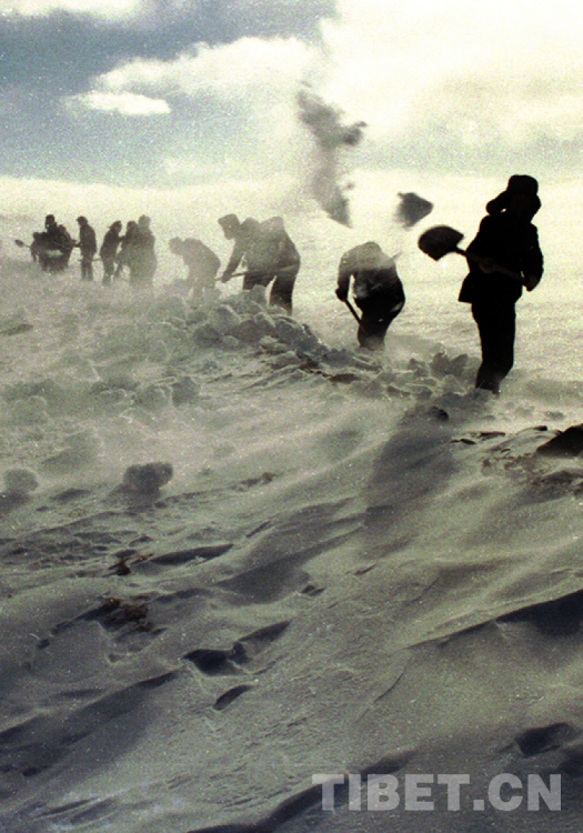 這是109道班工人在風雪中鏟雪開路,確保青藏公路的暢通(唐召明1990年冬攝)