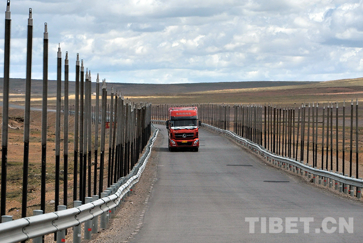 這是一輛卡車正在通過青藏公路兩邊立有一根根熱棒的凍土路段。熱棒是一種高效熱導裝置,可保持凍土終年不化(唐召明2015年8月12日攝)