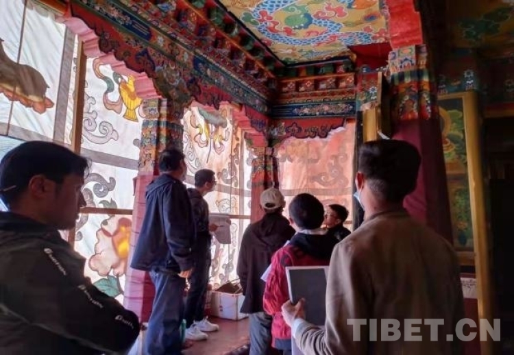 圖為2021年,西藏民族大學實習生參與檢查杰拉康寺木構建筑的破損程度,并對設計方案提出意見