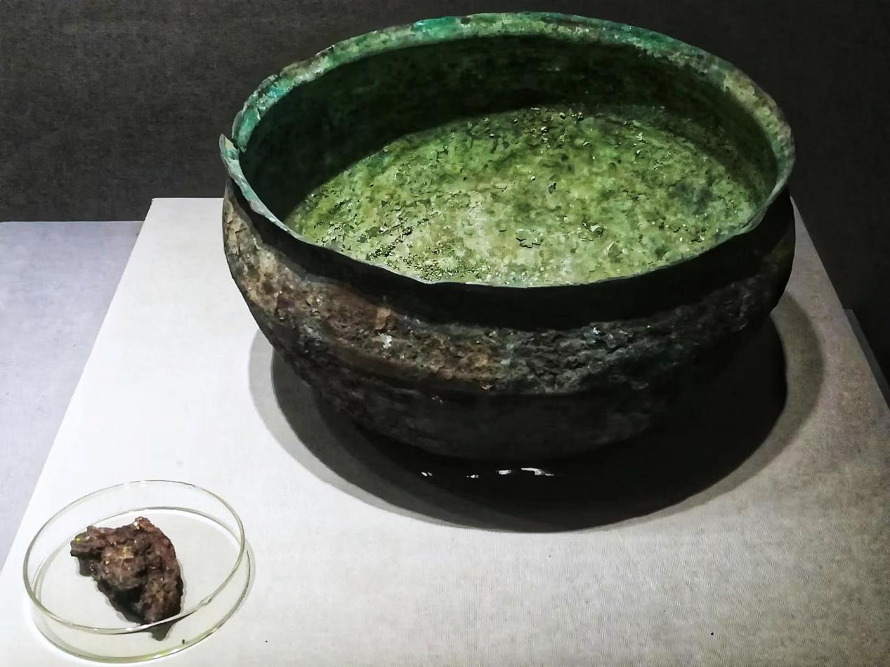 圖為西藏自治區阿里地區噶爾縣故如甲木墓地出土的青銅茶鍋和茶葉 攝影:李元梅
