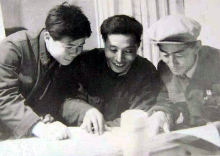 這是李業壯(左)在那曲地區農機廠工作時,與藏族副廠長典地(中)、藏族技術員覺吉(右)一同研究開發新產品 (唐召明提供,1978年攝)