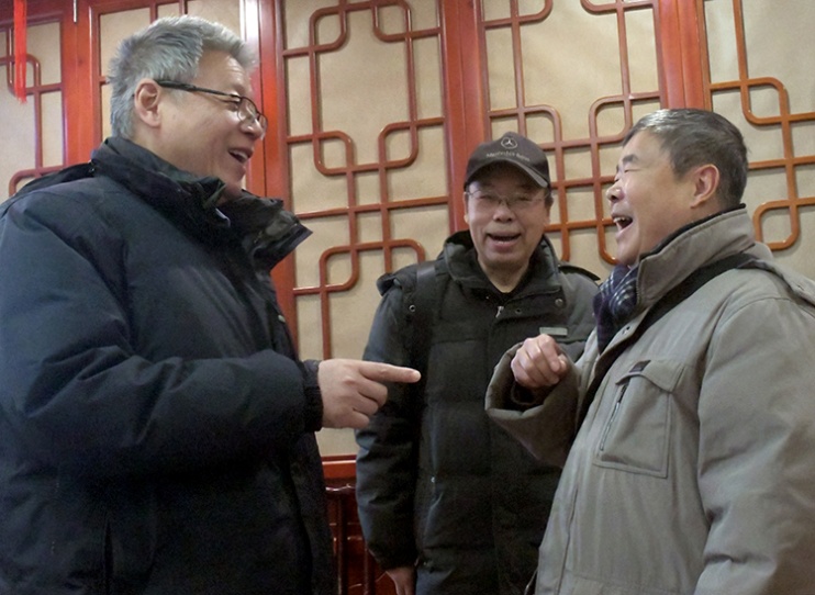 這是北京建藏援藏工作者協會原會長范小建(左)、原副會長羅廣武(中)和李業壯(右)在暢談西藏往事(唐召明2019年12月26日攝)