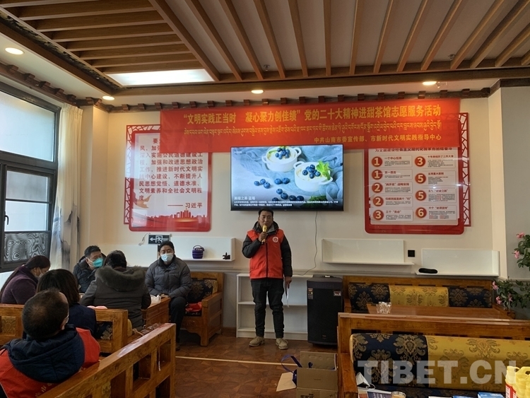 圖為山南市委宣傳部、山南市文明辦在文明實踐示范點開展黨的二十大精神進甜茶館志愿服務活動