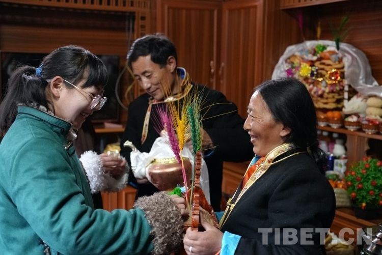 天亮以后,扎西江村一家人穿上新衣服,輪流敬切瑪、喝青稞酒,互道“扎西德勒”。扎西江村家的小女兒達娃倉決吃切瑪的時候,先用拇指和食指抓起一小撮糌粑灑向空中3次,表示敬天地,然后把糌粑放進自己嘴里。喝青稞酒也同樣如此,要先用雙手接過酒杯,然后左手拿杯,右手無名指輕輕地在杯中蘸酒,彈向空中,如此反復三次。