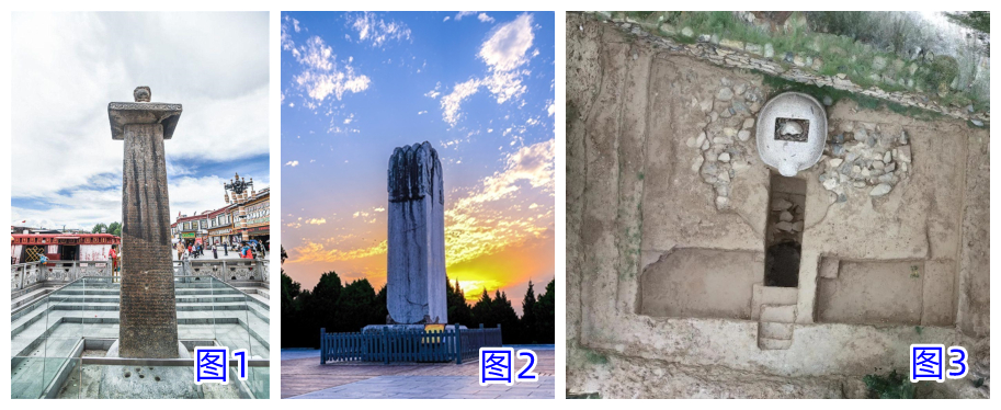 圖1為拉薩大昭寺前的唐蕃會盟碑 圖片來源:中國西藏網;圖2為唐乾陵的無字碑 圖片來源:中國乾陵網站;圖3為西藏曲水溫江多遺址龜趺及房址 圖片來源:國家文物局