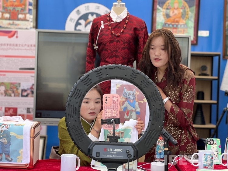 在展示交流區,兩名穿著藏裝的姑娘正在通過直播向觀眾介紹有十二生肖圖案的被子、手機殼、筆記本等各類產品,也吸引著現場嘉賓前來參觀。“這些作品是民族文化產業系學生的作品,圖案都是學生自己繪畫的原創文創產品。”西藏技師學院數字信息產業系教師桑珍介紹,“兩位姑娘是21級電商專業學生,通過這次活動一方面希望自己得到鍛煉,另一方面也是為7月份的電商大賽做前期的培訓。”