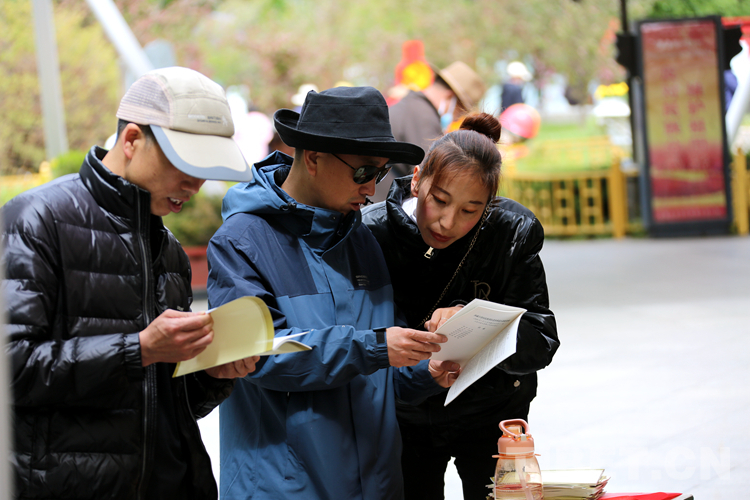 圖為在現(xiàn)場(chǎng)參加活動(dòng)的群眾、游客翻閱宣傳手冊(cè)并聽取宣傳人員的講解 攝影:王佳豪
