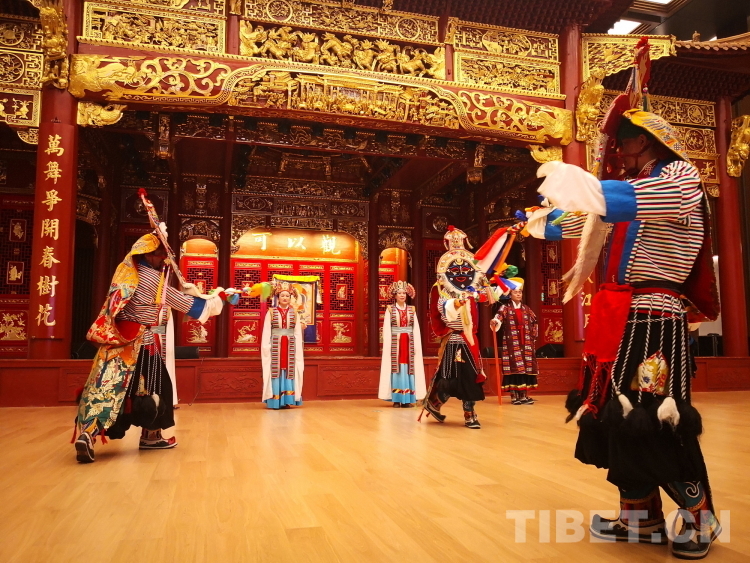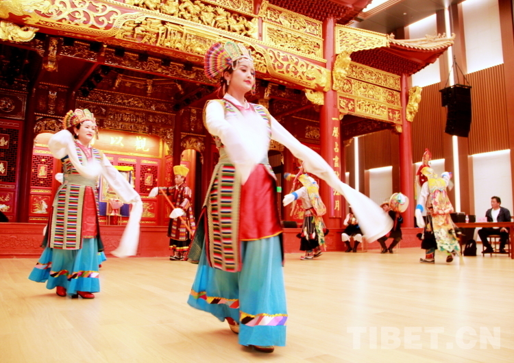 圖為西藏自治區拉薩市城關區娘熱民間藝術團的藝術家們在“戲舞雪域——多元文化視野中的藏戲藝術推廣研討會”上表演藏戲開場《溫巴頓》片段 攝影:劉莉