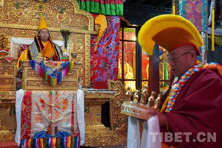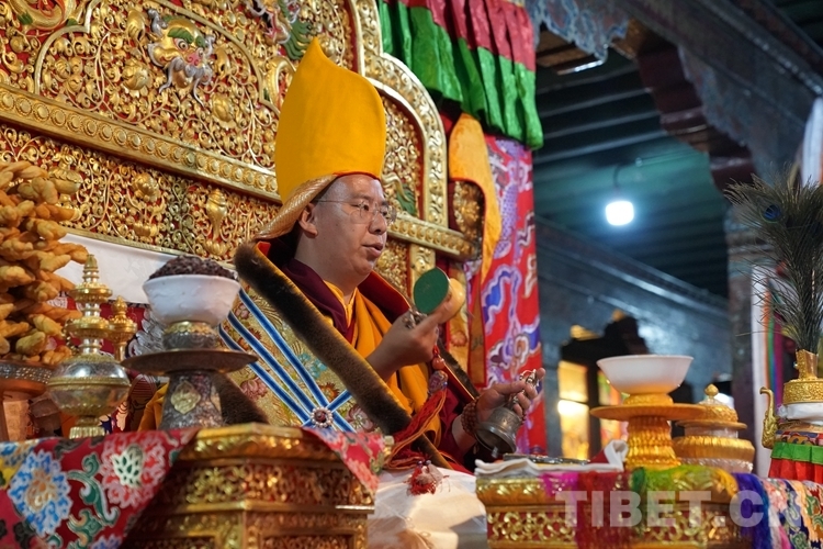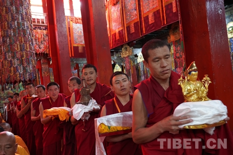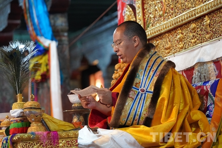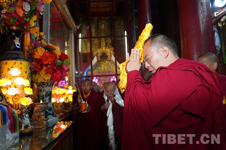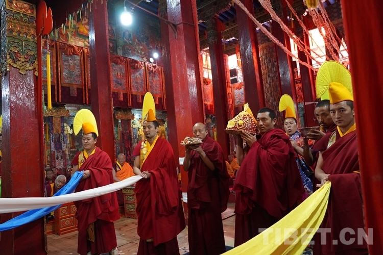 在措欽大殿內,班禪每到一座佛像前都雙手合十為眾生祈禱,并向佛像敬獻哈達,祈求國泰民安、利樂眾生。措欽大殿內的眾僧也并排而坐齊聲誦經、虔誠祝禱。禮佛后,班禪登上措欽大殿寶座,寺廟高僧代表向班禪敬獻曼扎(佛像、經書、佛塔)、誦祈愿永駐贊;班禪向寺廟僧眾傳授賜予《文殊真實名經》,并為僧眾摸頂。
