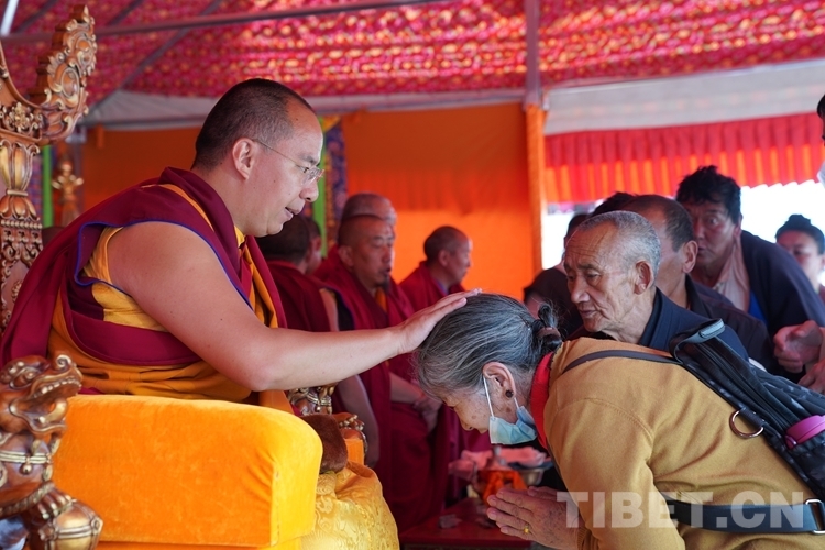 年逾七旬的洛桑巴姆得到班禪摸頂后倍感殊勝,激動地落下了眼淚。“能拜見活佛特別開心,得到活佛的摸頂賜福是我的福分。”洛桑巴姆不斷回頭面向班禪躬身祈禱,久久不愿離去。