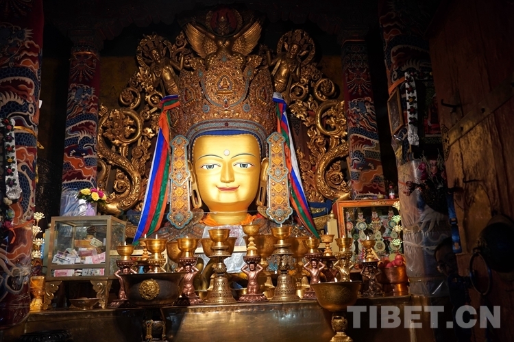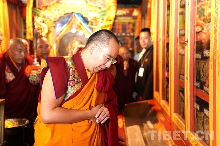 上午9時,在僧眾的期盼中,班禪抵達哲蚌寺。頓時,鑼鼓喧天,法螺、法號齊鳴。在手持香爐的高僧以及吹嗩吶的僧人引路,手持黃傘的高僧護送下,班禪緩步走進措欽大殿,逐一朝拜寺內各殿堂,并向主供佛像敬獻哈達。期間,班禪還前往甘珠爾拉康參訪,這里藏有多部《甘珠爾》大藏經。