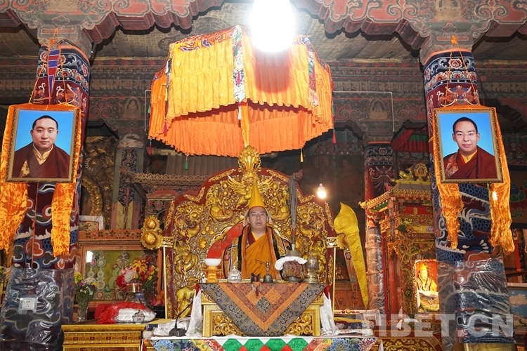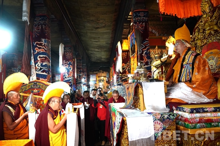 隨后,班禪登上措欽大殿法座為僧眾解經釋教、摸頂賜福。