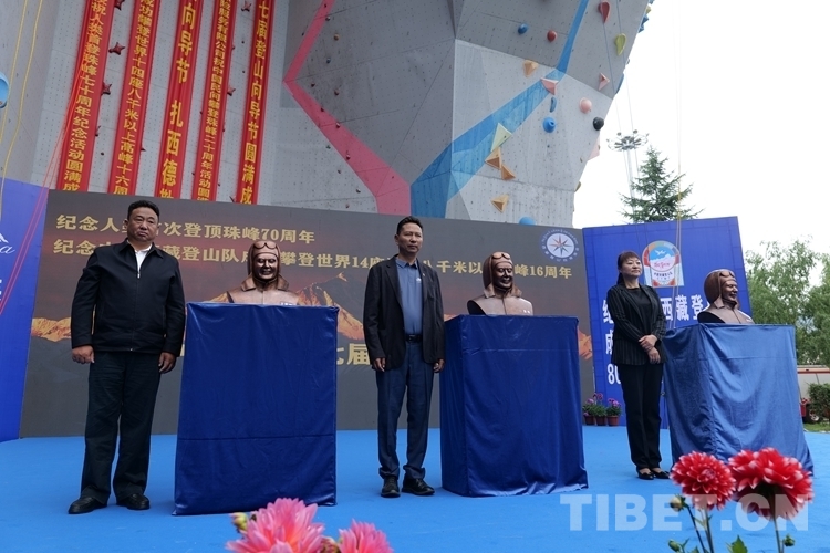 圖為開幕式現(xiàn)場為王富洲、貢布、屈銀華雕塑揭牌 由活動主辦方供圖