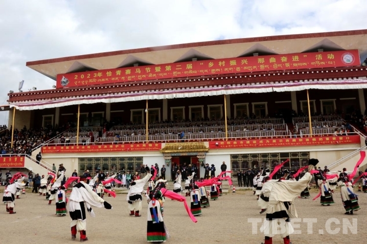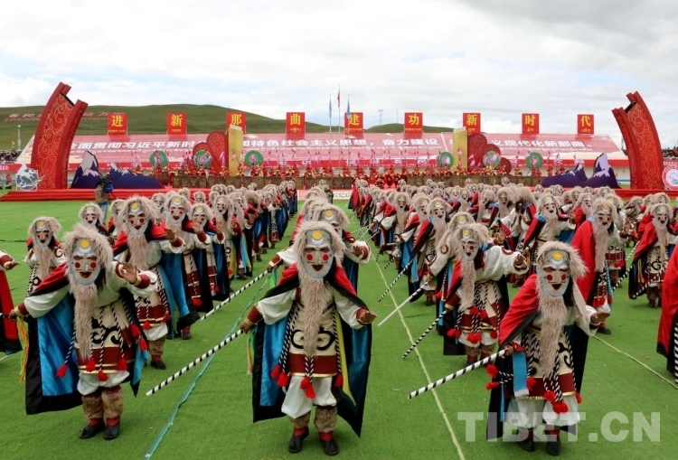 開幕式文藝演出分為《草原飛歌》《奮進那曲》《幸福歌聲》《吉祥鍋莊》四個章節。格薩爾說唱和折嘎說唱等西藏傳統藝術瑰寶、“鄉村振興 那曲奮進”活動中涌現出的優秀文藝作品、西藏自治區內外著名歌手歌曲連唱、那曲各族人民共跳歡快鍋莊等悉數登場,帶動開幕式現場氣氛到達高潮。
