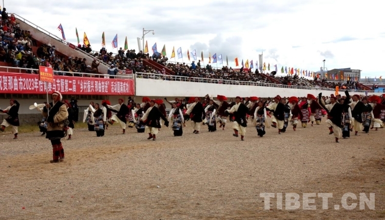 開幕式以方隊入場儀式拉開序幕,國旗方隊、會標方隊、民兵方隊、“鄉村振興 那曲奮進”冠軍代表方隊、文藝代表隊以及那曲11個縣區代表隊和馬術表演方隊依次入場。那曲各族干部群眾身著盛裝、載歌載舞,充分展示了藏北民族優秀傳統文化以及新時代那曲各族人民幸福安康、奮發進取的新風采。