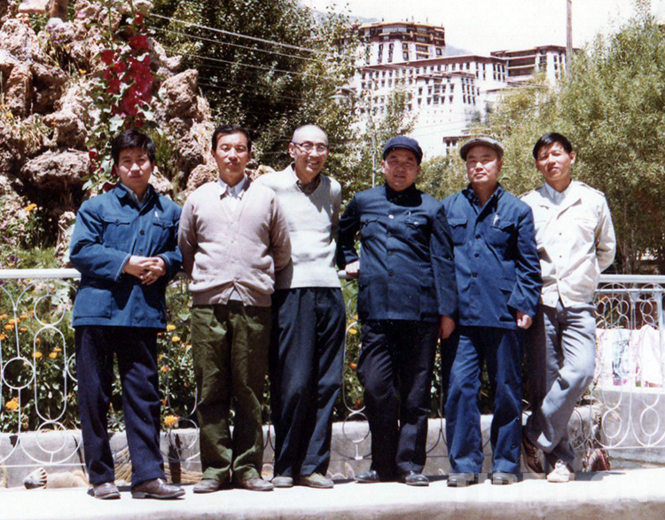 原國務院西藏經濟工作咨詢組駐藏組范小建(右一)與本組人員趙清政、石萬鵬、齊曉魯、府培生、冉令申(從左至右)在拉薩布達拉宮前合影留念(范小建提供,1984年6月攝)