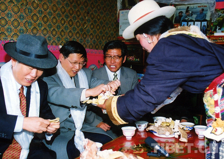 時任農業部副部長范小建(左二)在隨慶祝西藏自治區和平解放五十周年代表團再次回到西藏時,與代表團其他成員一同在藏族群眾家中做客,了解生產和生活情況(范小建提供照片,2001年9月攝)