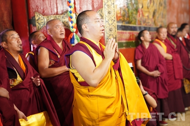 在措欽大殿,班禪虔誠叩拜供奉于此的佛祖釋迦牟尼佛像和藏傳佛教格魯派始祖宗喀巴佛像,與僧眾共同念誦經文,之后回到寢宮拉讓殿。