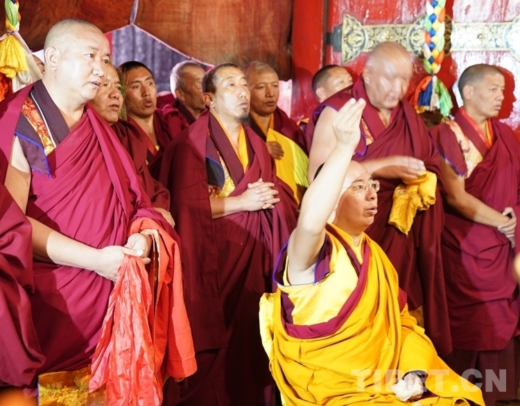 當日下午,在扎什倫布寺拉讓日光殿,班禪登上法座,接受扎什倫布寺管委會僧人成員、高僧朝拜,為他們摸頂賜福,并帶領高僧誦經祈福。