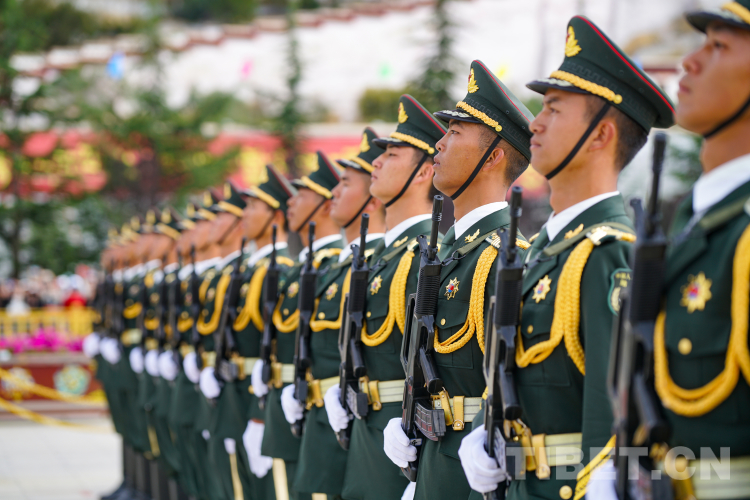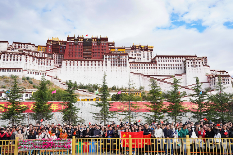 十月的拉薩秋高氣爽,云淡風輕。升旗儀式正式開始前,布達拉宮腳下站滿了各地游客,他們有的揮舞著小旗,有的臉上貼著“我愛你中國”貼紙,期待著在海拔3650米的拉薩為祖國母親慶生。廣場內,西藏各族群眾身著節日盛裝,整齊肅立,共同期待五星紅旗冉冉升起的莊嚴時刻。
