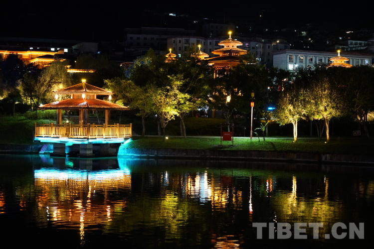 從福建援藏到廣東援藏,墨脫縣城的迅速發展離不開援藏兄弟省份不遠千里深入喜馬拉雅腹地,走進這朵圣地蓮花。蓮花圣地公園是每一個來墨脫縣旅游的人必打卡的地方,這里曾經是一片沼澤地,在廣東省第七批援藏工作隊的規劃和建設下于2016年4月竣工,如今有湖泊、曲廊、涼亭、籃球場等齊全的基礎設施和園林景觀,成為了游客和當地人休閑的好去處。夜幕降臨,蓮花圣地公園內的景觀燈倒映在湖泊當中,一位來自四川的游客一邊拍照一邊和同行伙伴說“這里巴適得很。”