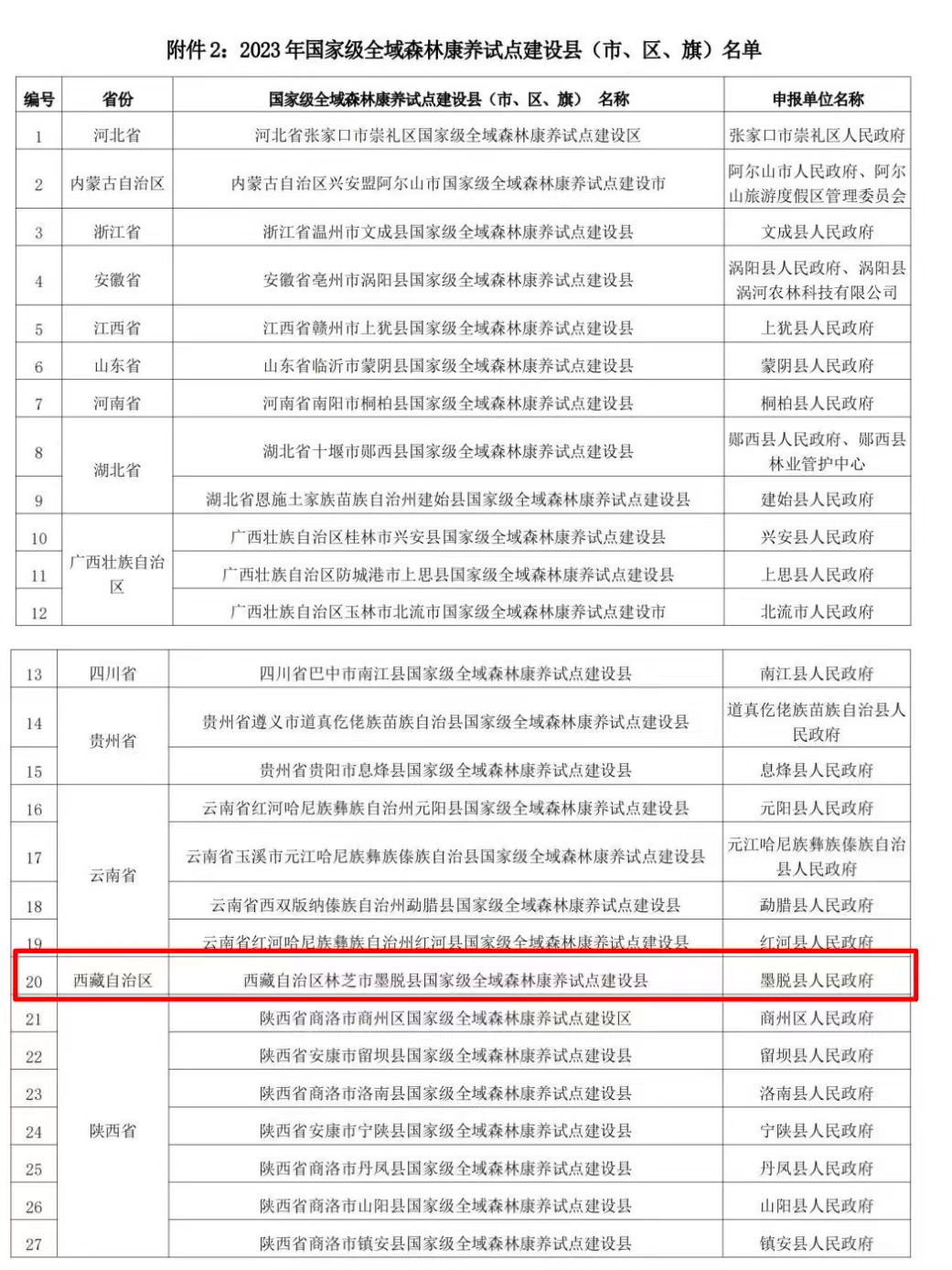 中國西藏網訊 11月22日,中國林業產業聯合會公示了2023年國家級森林康養試點建設單位名單,西藏自治區林芝市墨脫縣入選2023年國家級全域森林康養試點建設縣,系西藏自治區唯一入選的縣。