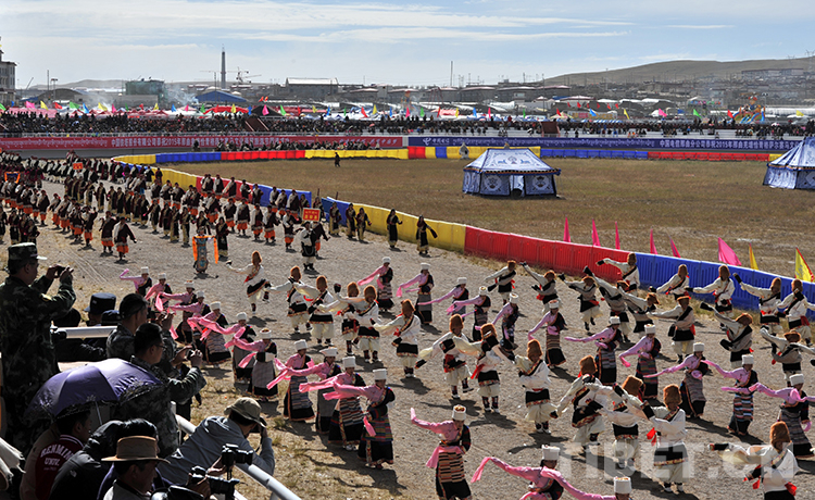 來自那曲地區(現那曲市)各縣代表隊在進行入場式表演。當日,那曲賽馬節在藏北首府那曲鎮開幕(唐召明2013年8月10日攝)