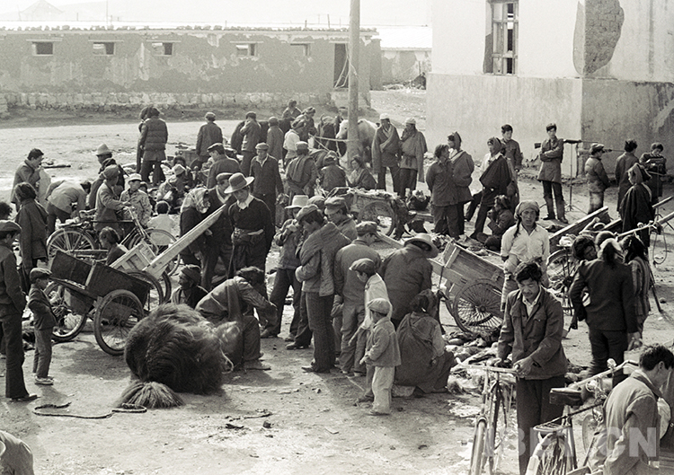 昔日那曲鎮露天市場,牧民群眾正在售賣現場宰殺的新鮮牦牛肉(唐召明1987年攝)
