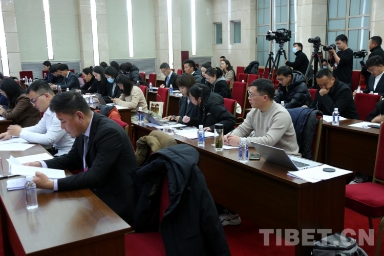圖為中央駐藏媒體及西藏自治區媒體代表在會上認真聽取新聞發言人通報相關情況 攝影:王佳豪