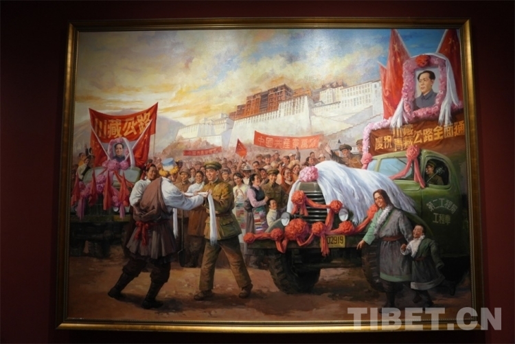 圖為順利會師紀(jì)念油畫,畫中為慶祝川藏、青藏公路全面通車的歡慶場景 攝影:陳浩力