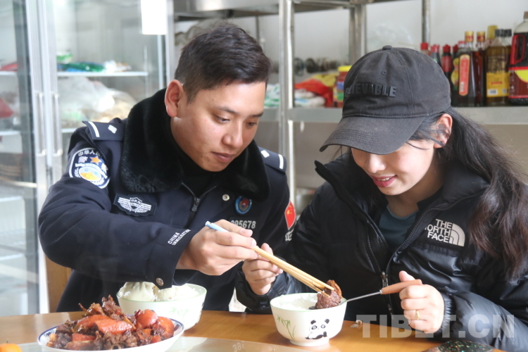 氧氣瓶、高原藥品、熱水......接德吉永措的車上已準(zhǔn)備好了各種抗高反和取暖的東西,這讓她提前感受到了來自丈夫單位的熱情與關(guān)懷。與愛人相聚后,旦增洛追帶著妻子參觀營區(qū),迫切地想讓她了解他用青春為之奮斗的警營,隨后他又帶著妻子到單位食堂品嘗自己親自下廚做的紅燒肉。“嗯!味道很好。”德吉永措吃著丈夫給她夾的肉,臉上洋溢著幸福的笑容。